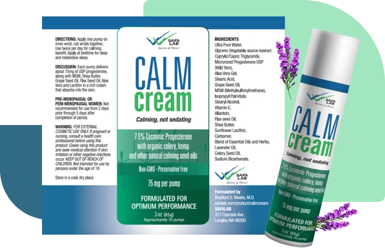 As a cosmetic cream, Calm Cream™ works from the outside in. While applied topically, the rate of absorption is higher when the progesterone does not need to be processed through the liver (“first pass metabolism”) where 90% of the hormone is degraded and wasted. Also the beneficial seed oils are omega 6 and pass easily though the skin to support calm feelings.